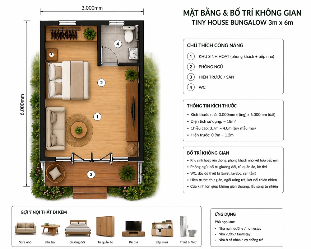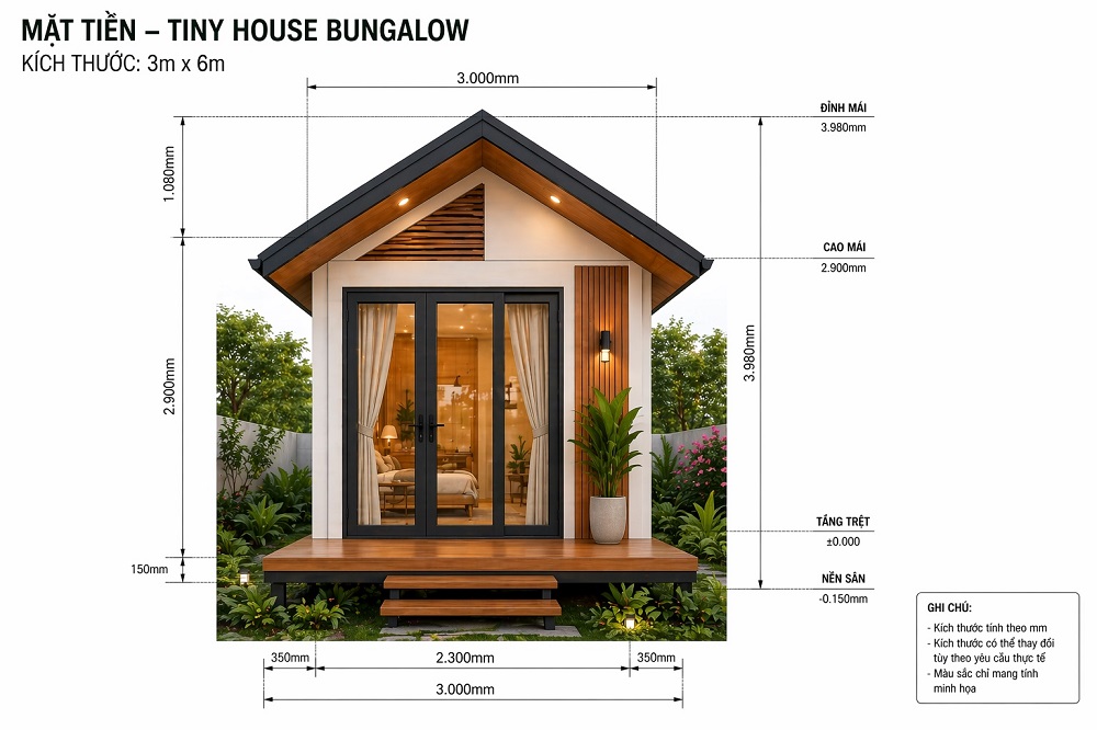 Tiny House bungalow là dòng nhà nhỏ 1 tầng, thiết kế mở ra sân vườn, mang lại cảm giác nghỉ dưỡng thoải mái và gần gũi thiên nhiên. Đây là lựa chọn rất phù hợp cho homestay, farmstay hoặc nhà ở vùng ven với chi phí hợp lý và thi công nhanh.