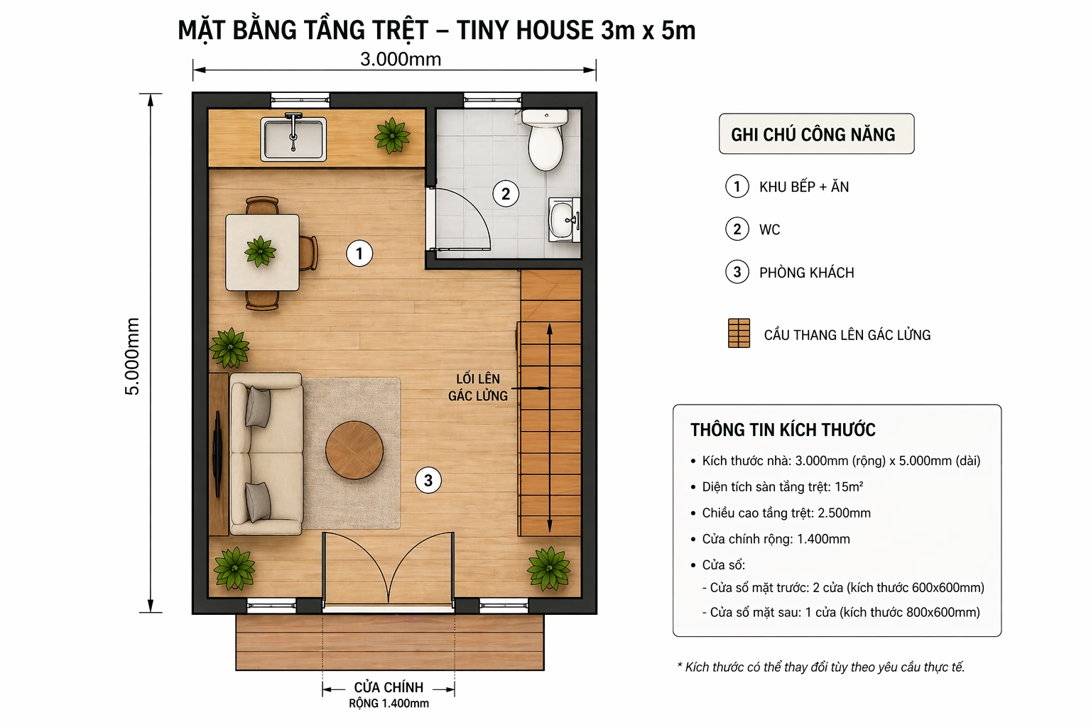- Tầng dưới: khu sinh hoạt + bếp + vệ sinh
